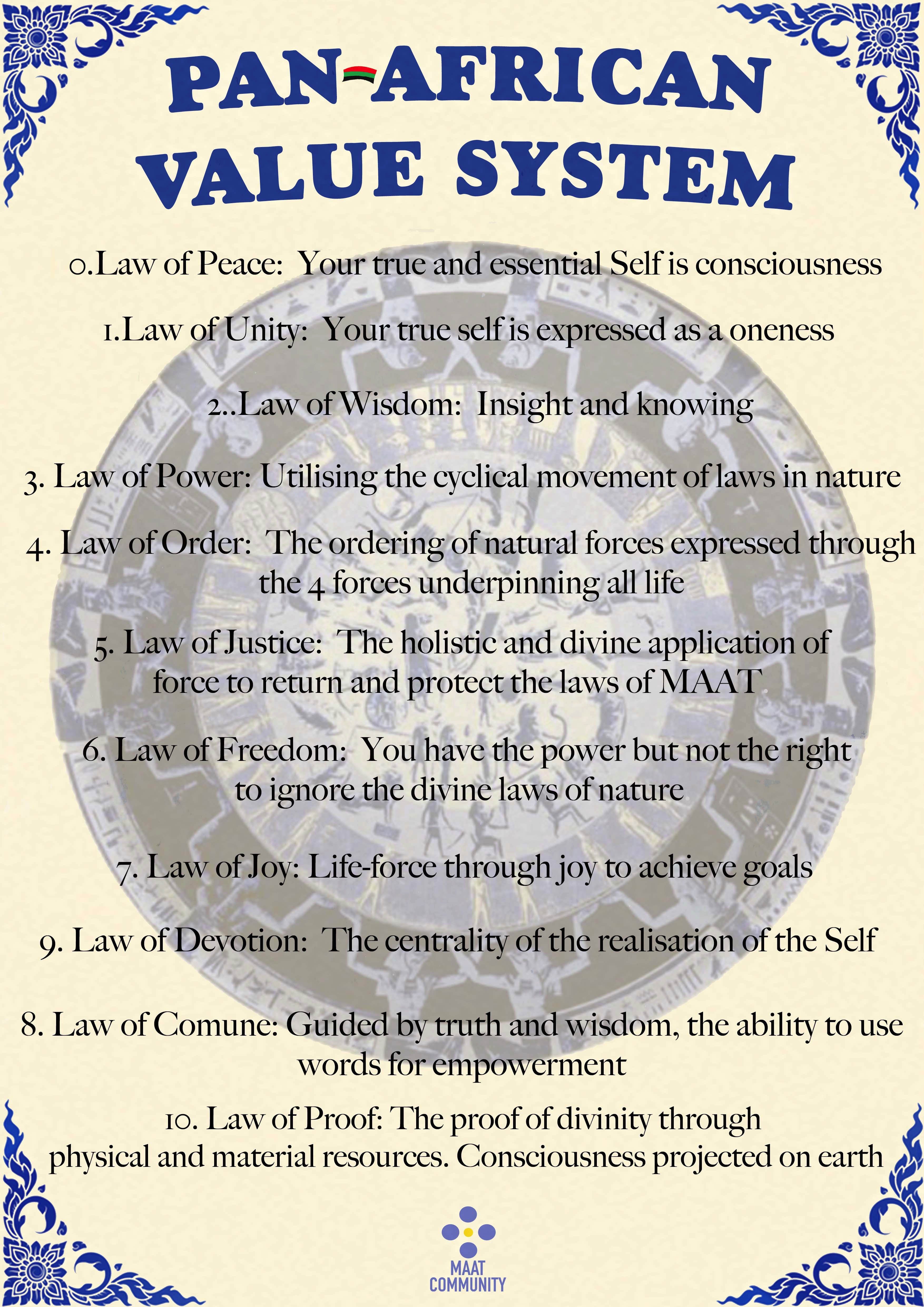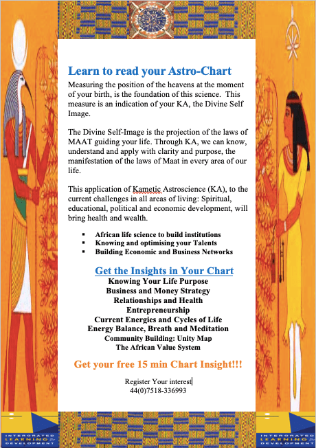 In this reconnection of Astrology to the root spiritual system as defined in Kametic spirituality, we are able to re-establish the original and lost keys for perfecting our development in all areas. The connection is seen primarily through the association of the planetary expression and the underlying laws of Maat. Please recall this system of Kametic Astrology is an integral part of African Life Science (ALS). In this system of ALS there is clear integration of Mathematics, Physical Science, spirituality, medicine, social Science, governance and all areas of life.